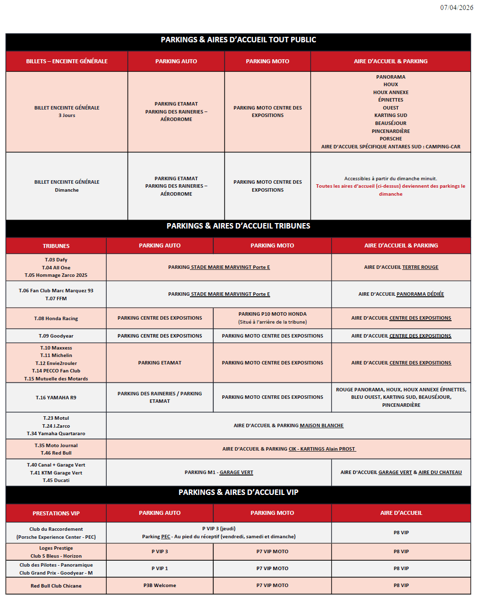 Les parkings et aires d’accueil mis à disposition sont compris dans le prix du billet. L’accès se fait sur la présentation de ces derniers. Aucune réservation, le placement est libre.